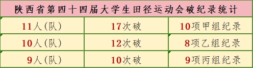 本届运动会11人(队)17次破10项甲组纪录,10人(队)12次破8项乙组记录,9人(队)10次破9项丙组纪录。