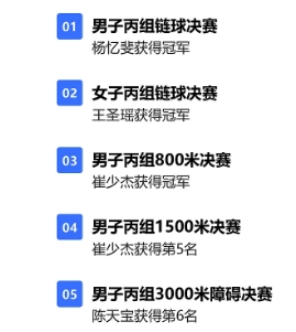 军,1500米决赛以4:02.37分的成绩获第五名,陈天宝顽强拼搏3000米障碍决赛以10:05.41分的成绩获第六名。