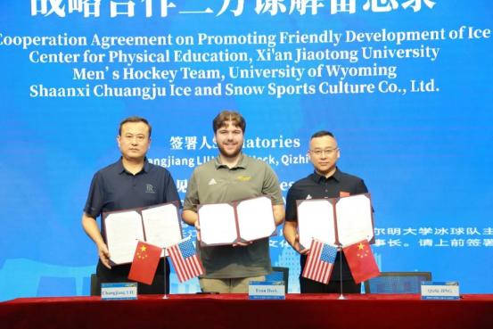 6月28日至7月5日,在陕西省与美国怀俄明州缔结友好省州关系十周年之际,西安交通大学体育中心与美国怀俄明大学冰球队、陕西创聚冰雪体育文化有限公司签署《冰球运动友好发展战略合作三方谅解备忘录》,构建“竞技体育—高等教育—产业服务”三位一体的国际化培养体系。西安交大体育中心主任刘长江、西安高新第一中学副校长蔡斌、陕西省体育产业集团有限公司副总经理、创聚冰雪董事长景启智、总经理景梅等领导嘉宾出席仪式并共同签约。该合作作为中美青年友好交流周核心成果,标志着两省州体育人文交流进入新阶段。