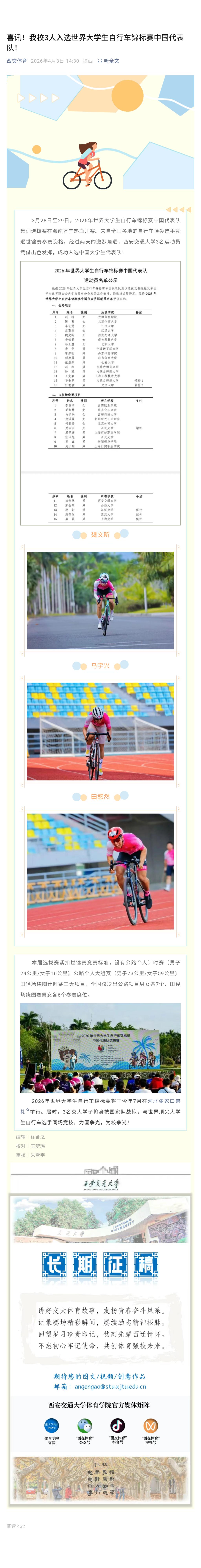 喜讯!我校3人入选世界大学生自行车锦标赛中国代表队!