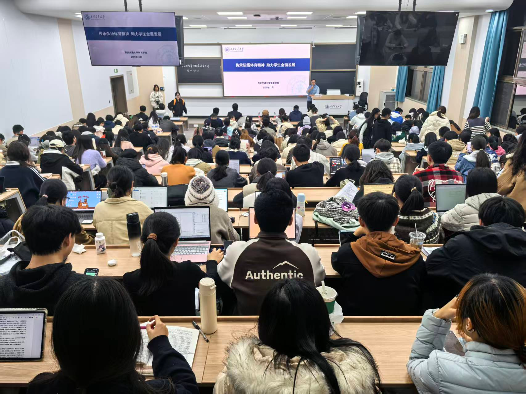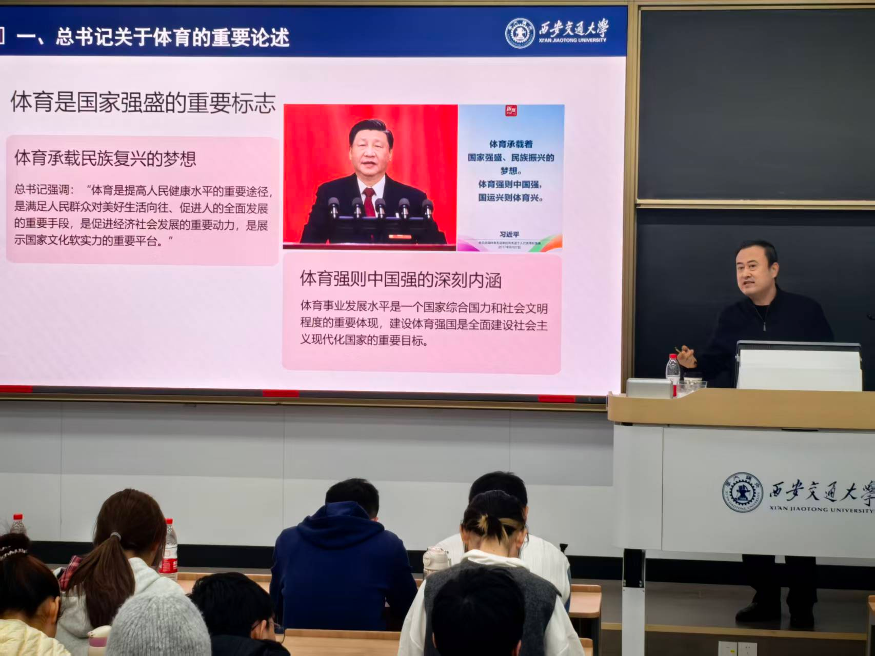 刘长江以“习近平总书记关于体育的重要论述”“体育精神的时代内涵”“近现代中国体育发展历程”“体育强国建设助力民族复兴”“交大体育工作概况及未来发展思路”等几个方面,通过详实的数据和珍贵的影像,将交大体育百年传统娓娓道来,让参会学子具象化理解了“体育强则国强”背后的深刻意义,进一步激发了学子们用体育拼搏之力诠释对祖国的忠诚与热爱之情。
