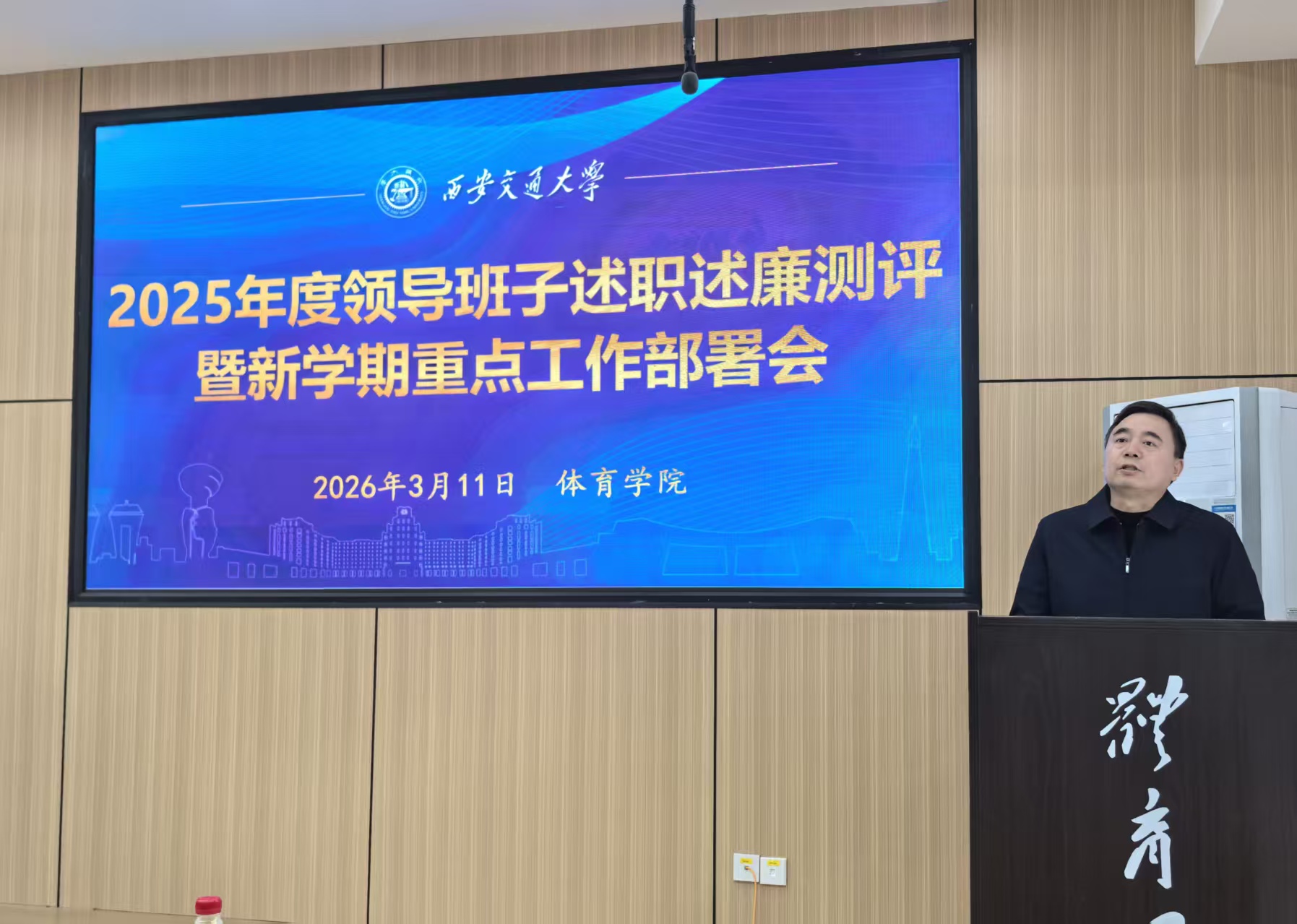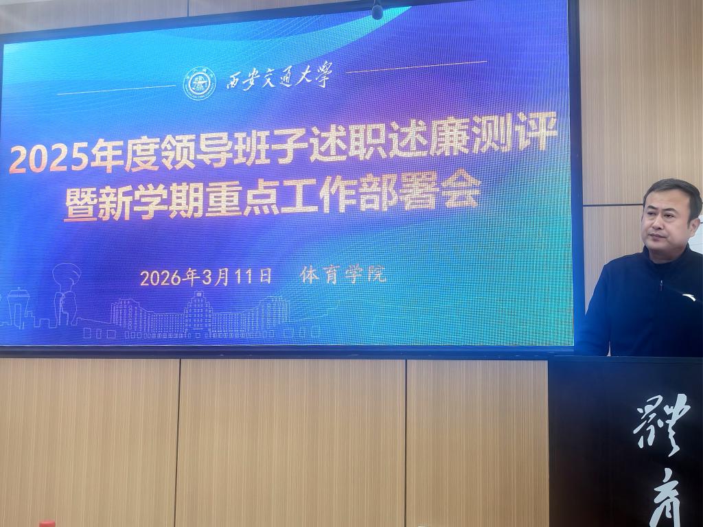 院长刘长江作个人述职述廉报告,并立足学校发展大局部署新学期重点工作。他强调,2026年是学校建校130周年暨西迁70周年的重要节点,更是“十五五”规划开局起步的关键之年,学院要把落实立德树人作为根本任务,坚持健康第一的教育理念,通过强化教育教学、群体课外、高水平竞赛、AI赋能、成果产出、合作交流等方式,以建设完整的专业人才培养体系为目标,打造小而精高质量发展的体育学院,为学校“双一流”建设注入体育动能。